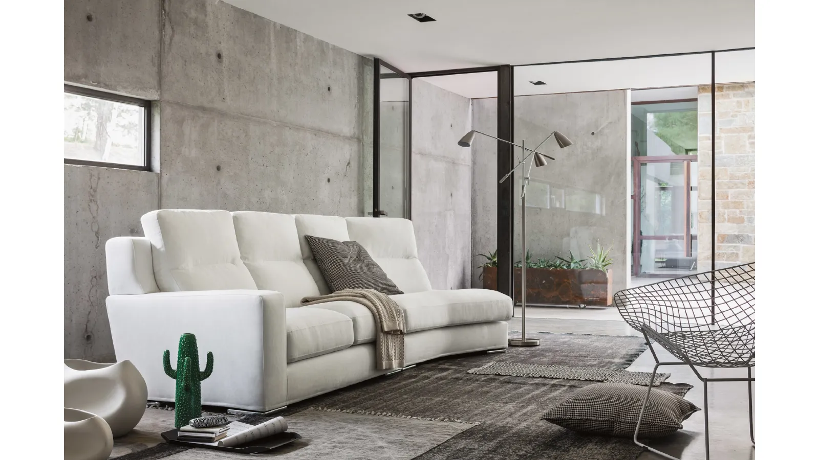 Divano con piedini piatti in acciaio, schienali leggermente curvi